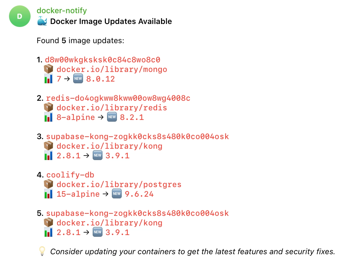 Docker Image Update Notify is a lightweight service that watches running containers and alerts you when a newer image is available. It is designed to drop into Coolify and other containerized environments, with an emphasis on efficiency, modularity, and production readiness.