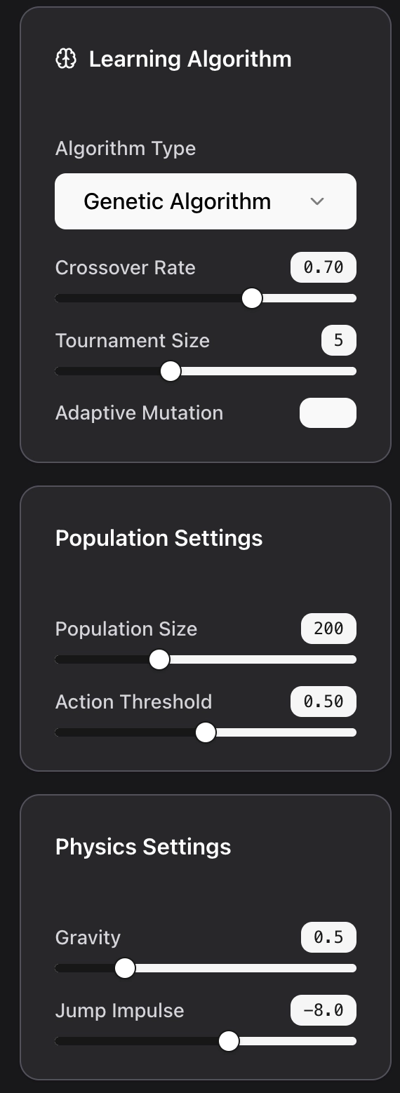 - Interactive Controls: Tune physics, NN, and evolution at runtime