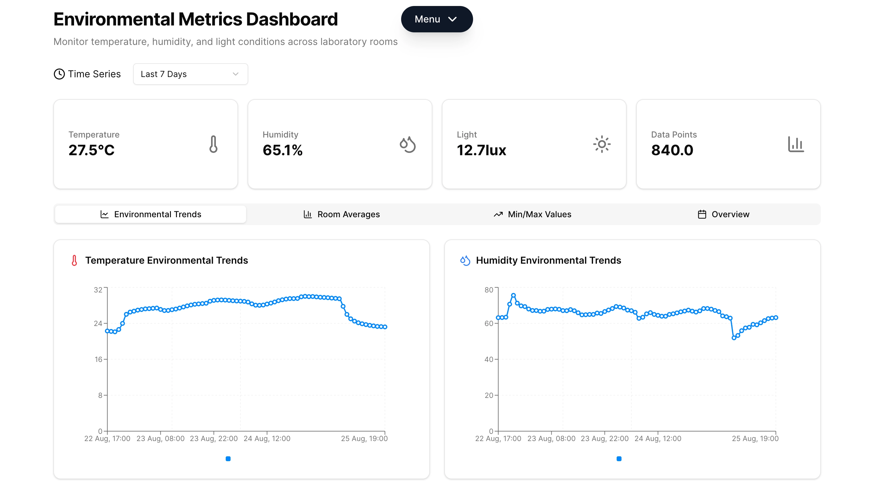 Small Raspberry Pi Zero 2W devices collect temperature, humidity, and illuminance via onboard sensors. Devices publish readings over MQTT. A Go service consumes, validates, transforms, stores, and checks thresholds; if anything looks off, it alerts researchers to investigate. The application provides a unified dashboard for monitoring all sensor data in real time and historical values.