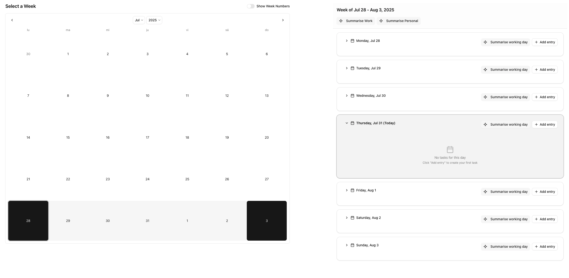 - A calendar on the left to select the week