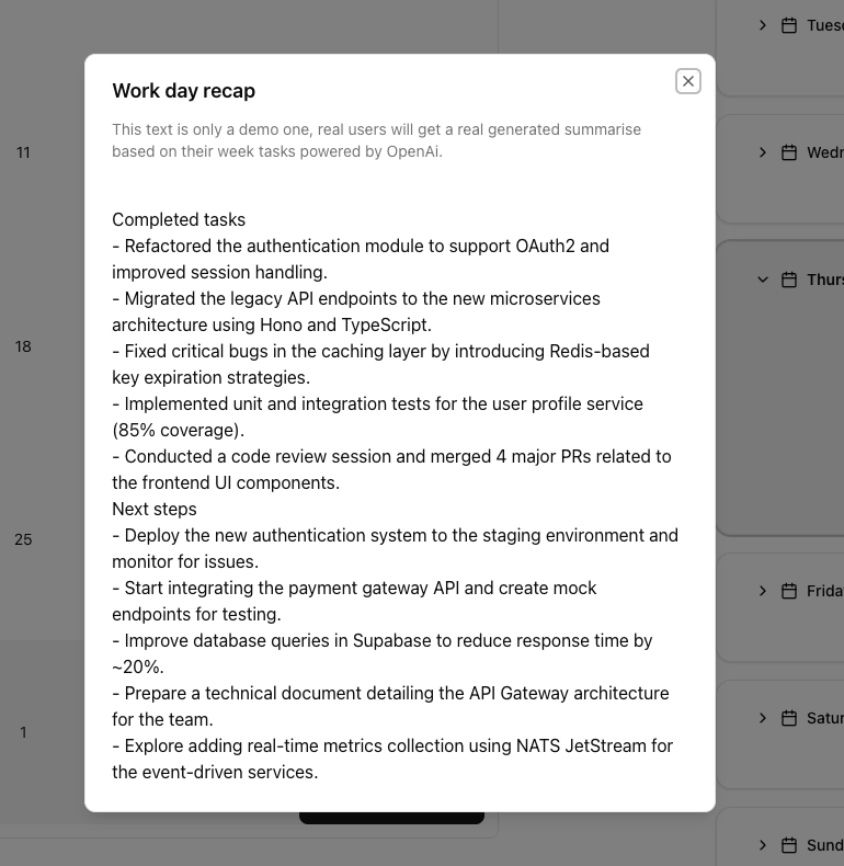 Every Friday my manager asked for a quick summary of the week and my plan for the next. I often realized I could not remember half of what I had done. That is what pushed me to build a lightweight tool to capture those tasks as they happen.